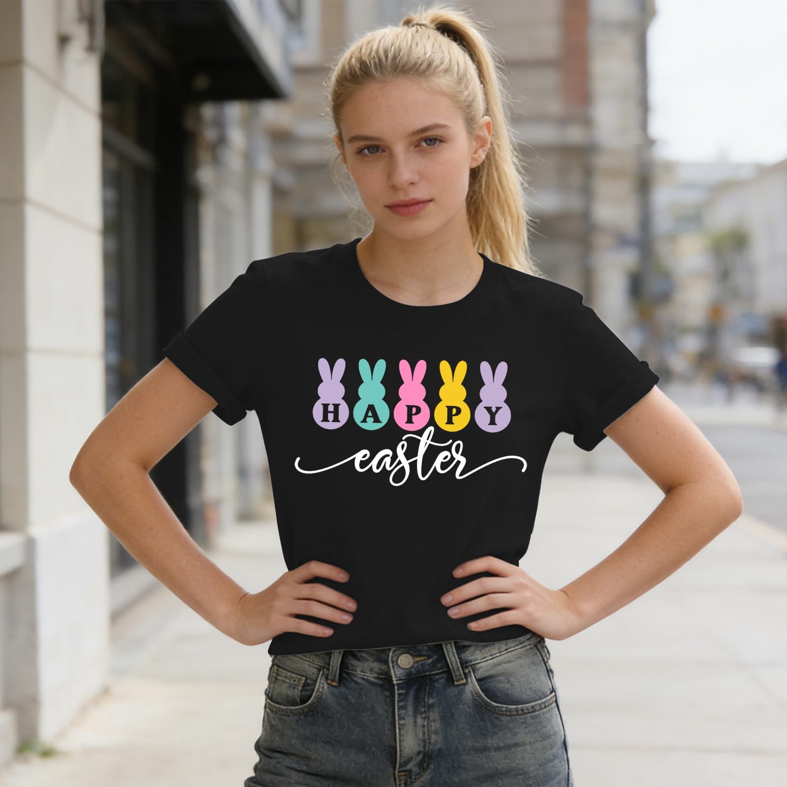 - These Happy Easter tee tops showcase minimalist hopping bunnies in refined pastels—never too “cutesy.” Perfect for café dates or family time, this Easter rabbit shirt for women offers subtle festive charm for the modern woman.
