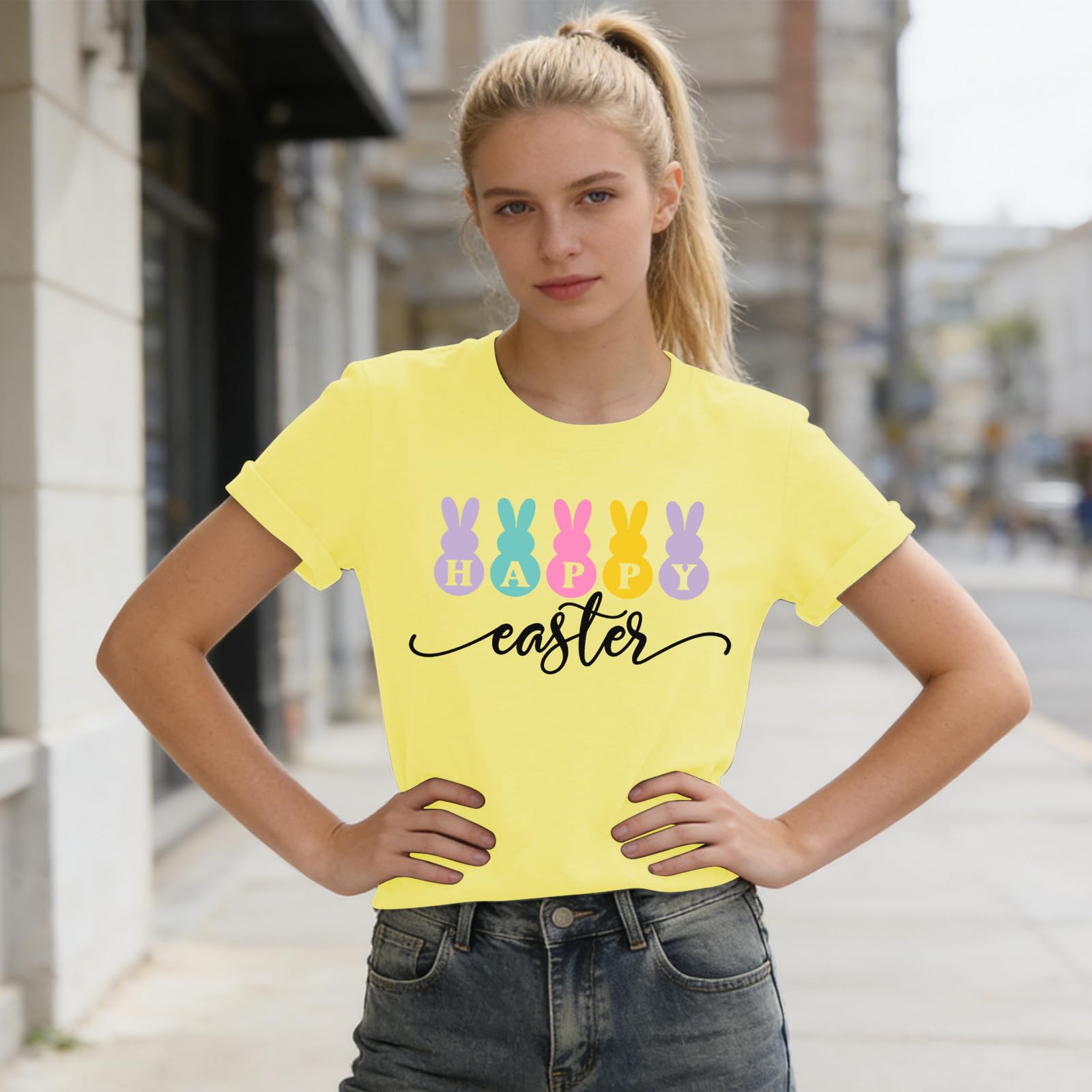 - These Happy Easter tee tops showcase minimalist hopping bunnies in refined pastels—never too “cutesy.” Perfect for café dates or family time, this Easter rabbit shirt for women offers subtle festive charm for the modern woman.