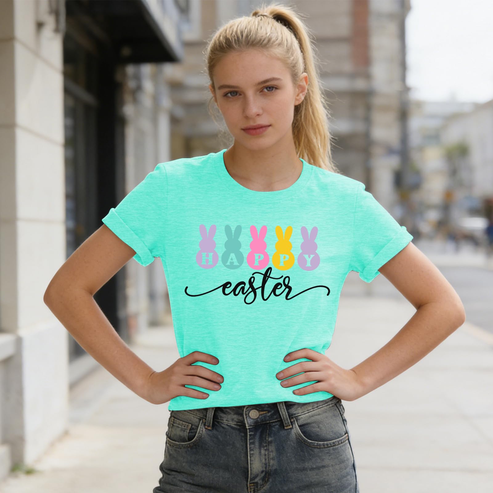 - These Happy Easter tee tops showcase minimalist hopping bunnies in refined pastels—never too “cutesy.” Perfect for café dates or family time, this Easter rabbit shirt for women offers subtle festive charm for the modern woman.