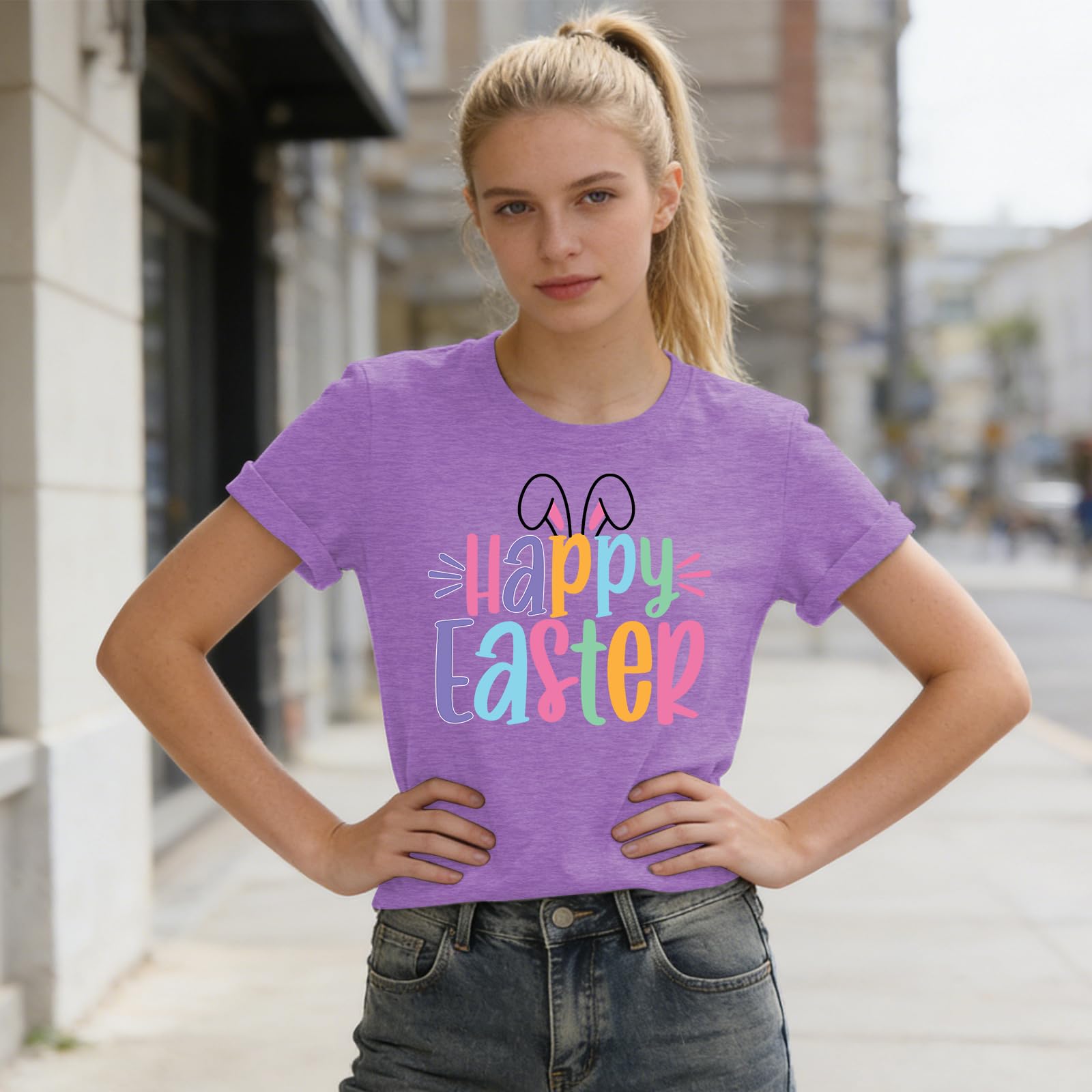 - Slip into this Happy Easter shirt for women—featuring pastel bunnies in dreamy blues and blush! A perfect Easter shirt for brunches or park picnics, bringing instant spring joy to your look.